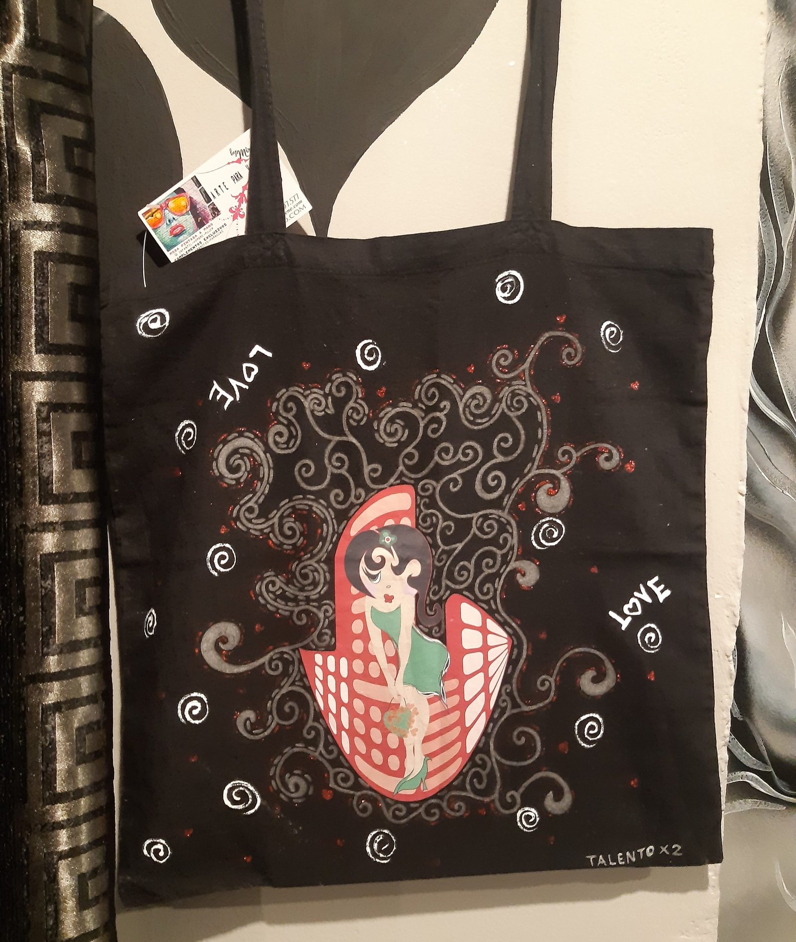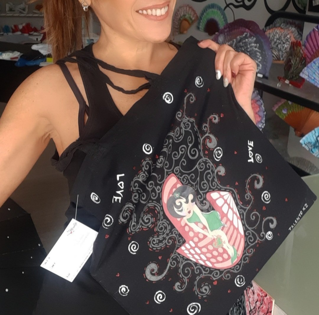 Originales y exclusivos diseños pintados a mano en bolsas de algodón de diferentes colores, y también combinados con ilustraciones en algunos modelos.